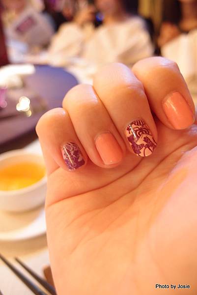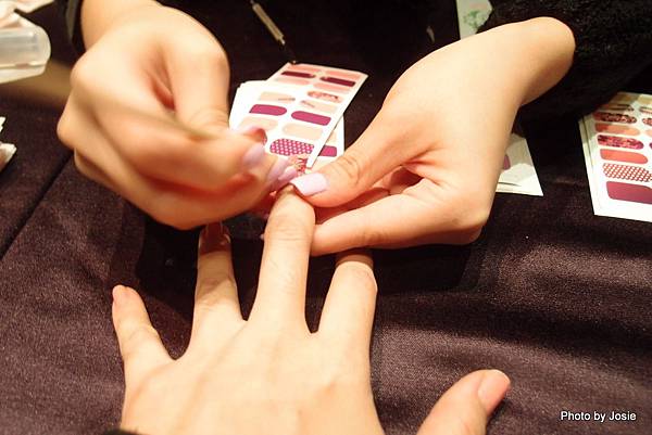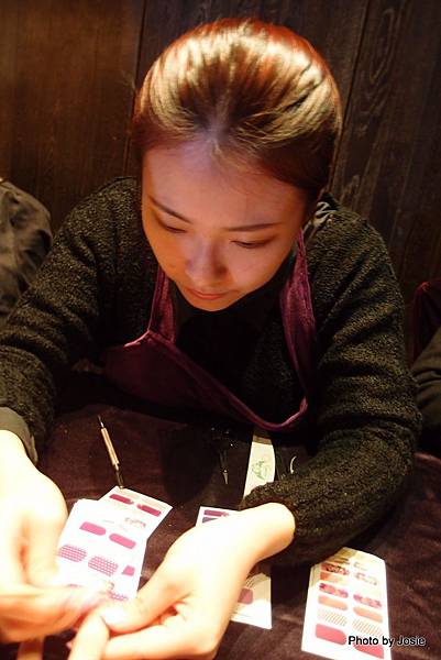 一整排坐滿滿,美甲師們一致的穿上紫色圍裙,認真的幫女孩兒們做指甲