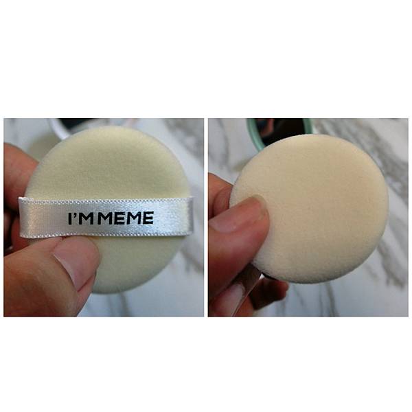 粉撲的部分,I'M MEME的有一條方便手拿的緞帶,它牌則較陽春