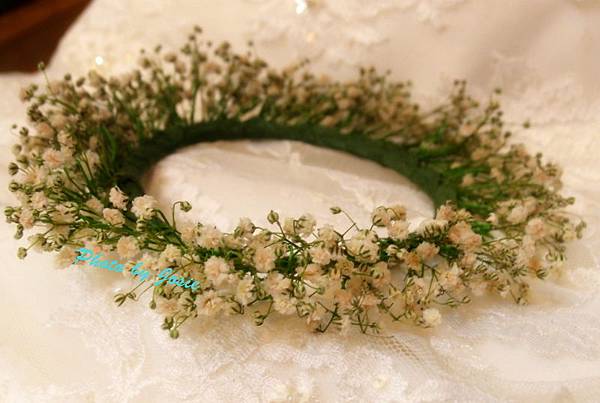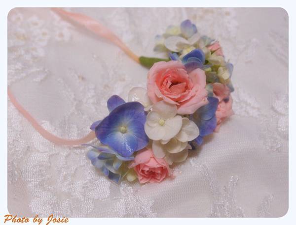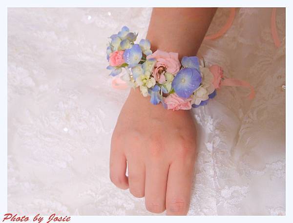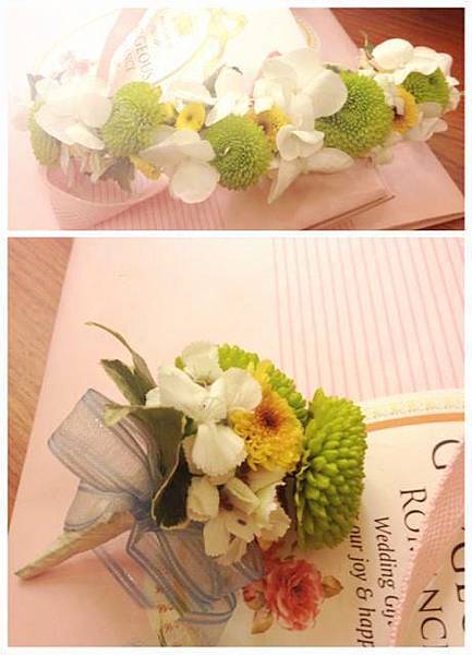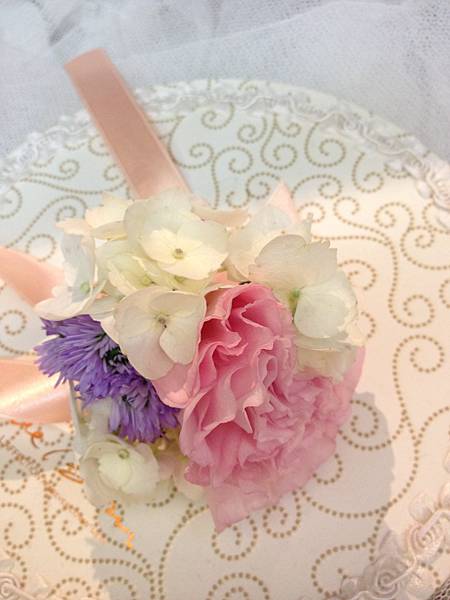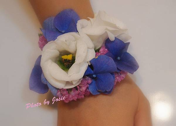 我用了繡球花做成的手腕花,看似簡單但工程繁瑣,花了我將近兩個小時才做成....