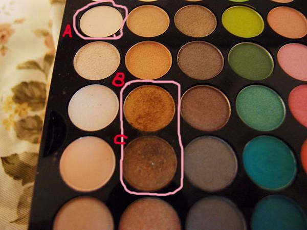 Step2.先將A輕輕的刷在整個眼皮至接近眉骨處,使眼皮明亮,再將B刷滿整個眼皮後將C刷在雙眼皮處(要記得刷的比雙眼皮高一些喔) 這樣就有層次了!!
