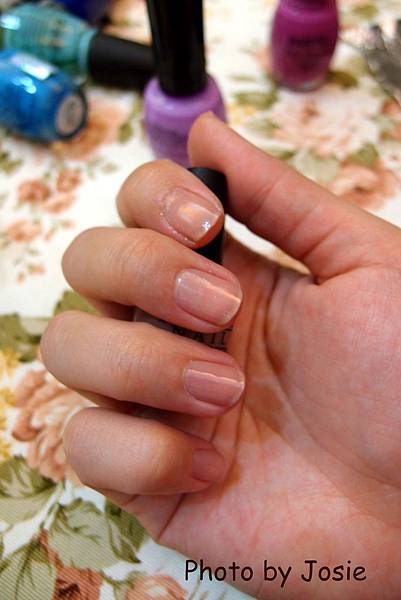 等指甲半乾後再用地一層底色整個指甲在塗一層!