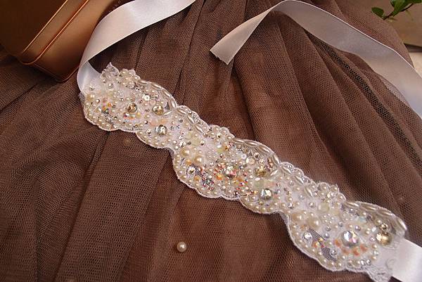 本來只是一條蕾絲,上面的鑽及珍珠也是一顆顆的黏,黏到我眼睛快瞎啦!!